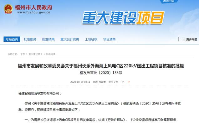 你司《关于商请核准福州长乐外海海上风电C区220kV送出工程的函》(福能海峡函〔2020〕25号)及有关附件收悉。经研究,现就该项目核准事项批复如下: